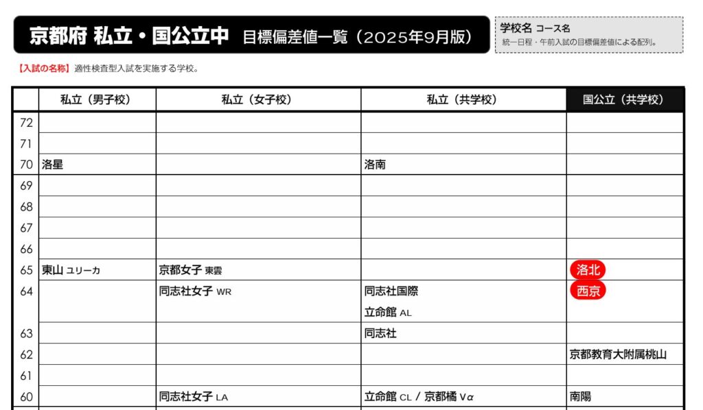 以下の偏差値表(※立誠学院グループ作成)の通り、西京中と洛北中は、まごうことなき「難関校」です。