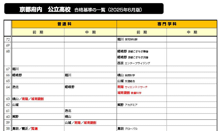 そしてまた、日吉ケ丘高校など、通学圏を越えて若干名の募集を行う例外もありますが、その場合は、難易度が急上昇します。学習塾で発表される偏差値一覧や「京都V模試」「五ツ木模試」等の合否判定だけでは、その難易度を正確には測れません。ご注意くださいね。