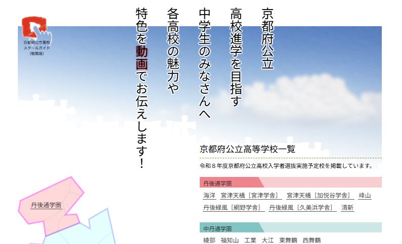京都府教育委員会においては、従来のスクールガイド(パンフレット)の配付に加えて、昨今はスクールガイドの動画版が公開されています。