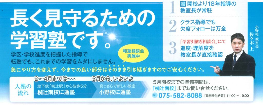 5月の開校までの準備期間中は、椥辻南校までお問い合わせください。